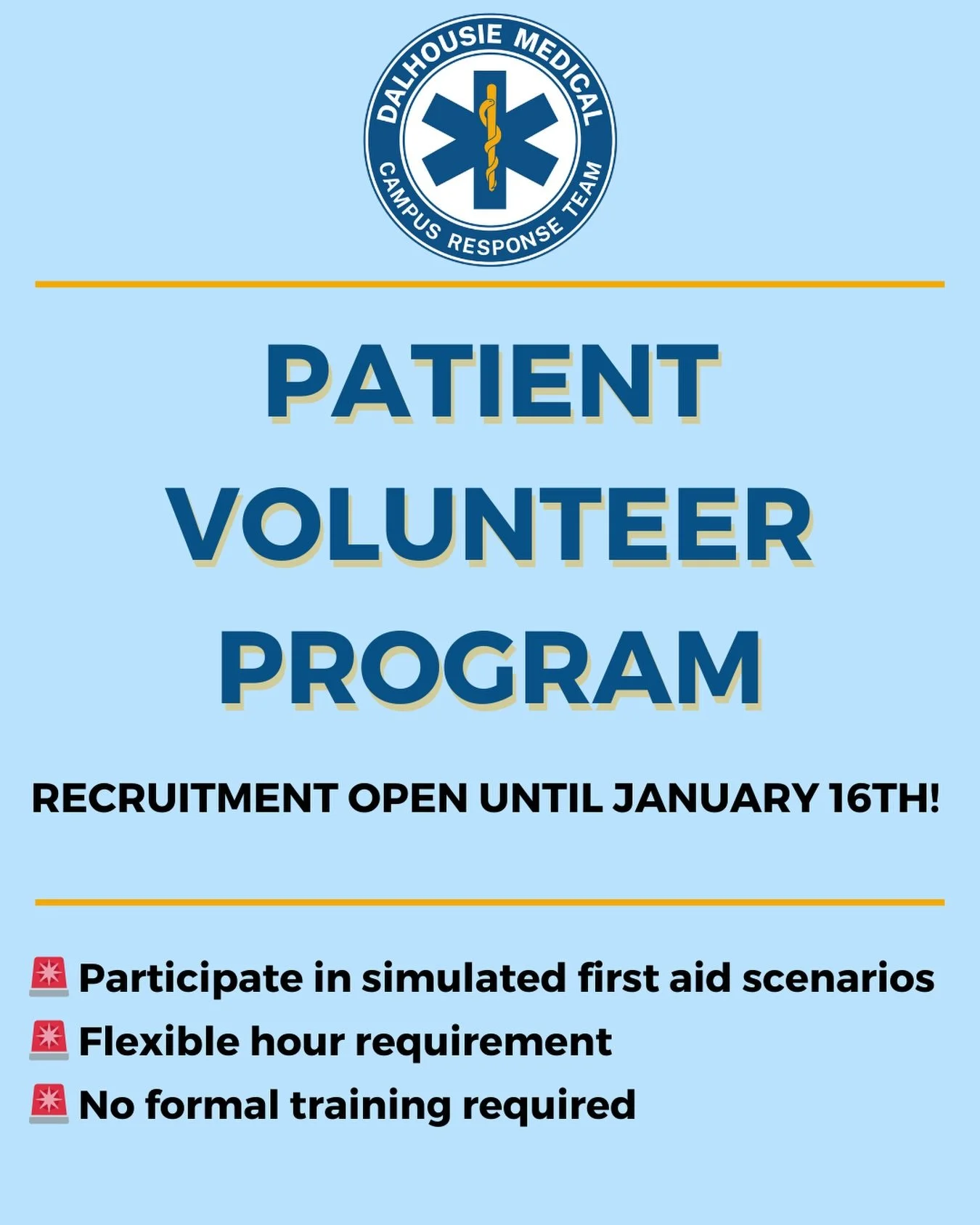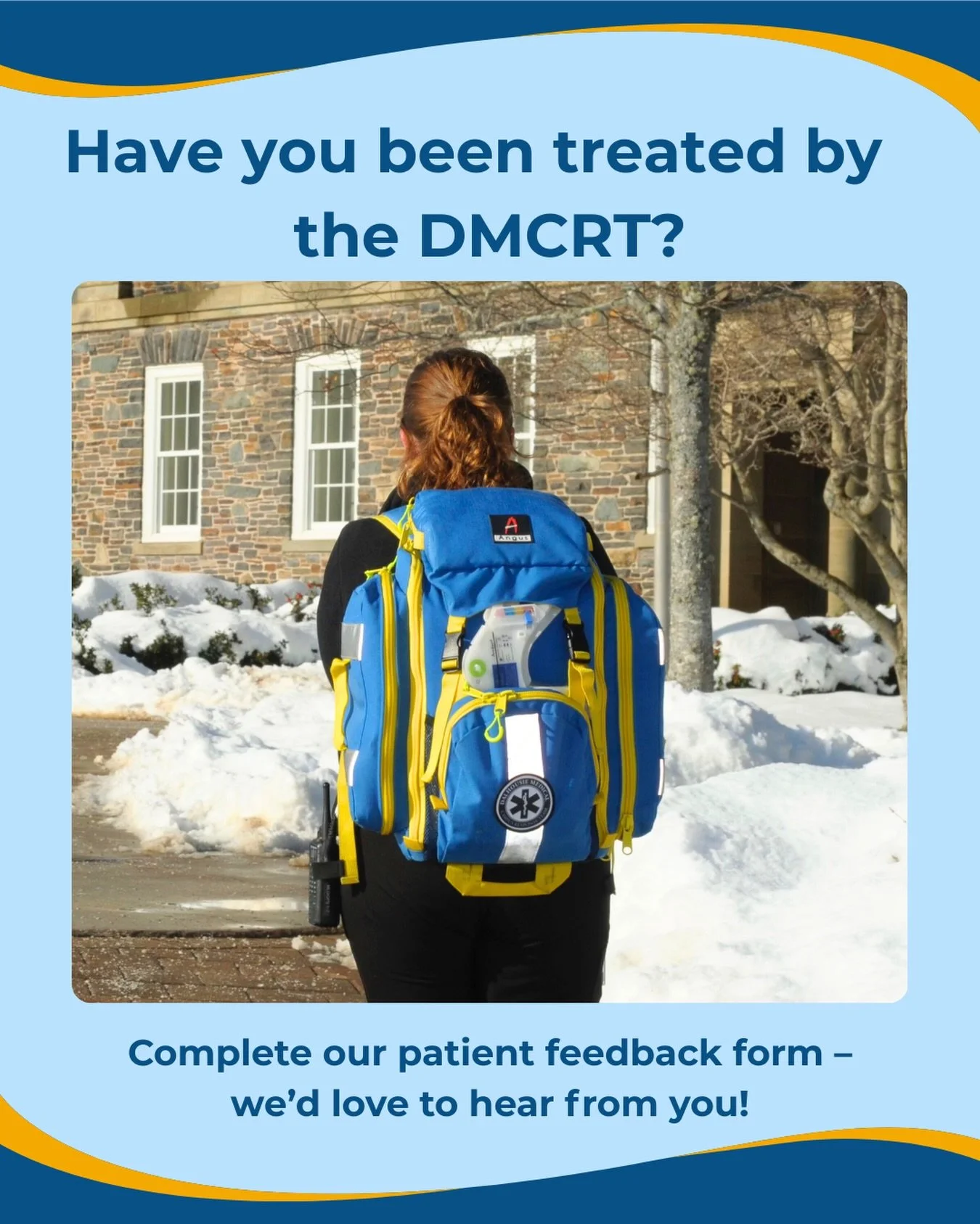 The Dalhousie Medical Campus Response Team is a student-run volunteer organization that focuses on providing first aid to the university community. With highly trained student Volunteer Medical Responders, DMCRT is proud to offer its services to all major events and activities that take place on campus. Equipped with advanced first aid certification and Mental Health first aid, DMCRT provides coverage to athletic events, recreational activities, orientation week, DSU society gatherings, and other special events.